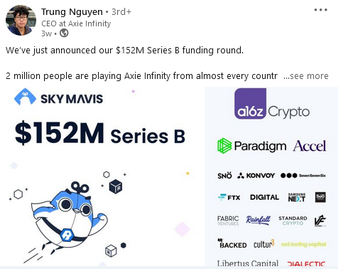 Axie Infinity is a game that has influences from Pokemon and World of Warcraft. Not only did the game prove to gain great popularity, but also it managed to secure impressive funds. Recently, Trung Nguyen - the CEO of Axie Infinity announced a $152M Series B funding round.