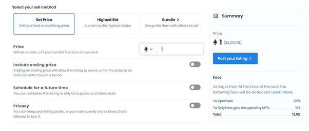 You can set a fixed price, you can make an auction and get the highest bid, or you can choose to include your NFT as part of a bundle. You might also set here the cryptocurrencies that can be used to purchase your NFT besides ETH, such as DAI or USDC which are stablecoins, thus they don’t fluctuate as much as ETH.