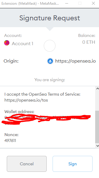 5) A pop-up will be displayed asking you to digitally sign into your account and to confirm that you agree with the terms of service of OpenSea.